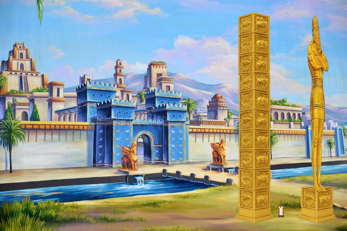 The image that Nebuchadnezzar set up was 10 times taller than it was wide. The tall Babylonian man gives you some idea of the size of this image. The image assumes that the Babylonian is about 6 feet tall. The wall and Ishtar gate in the background are about 40 feet tall. So the image, which is 60 cubits (90 feet), is twice as tall than the wall. The image is 60 by 6 by 6 cubits. The Bible does not describe the image, so I created an engraved pillar to give some sort of idea of the size and dimensions of this image. I also put a distorted image of a golden man as an example of how distorted the person would be to be 90 feet tall (even on a large platform). It seems more likely that it was some sort of obelisk.